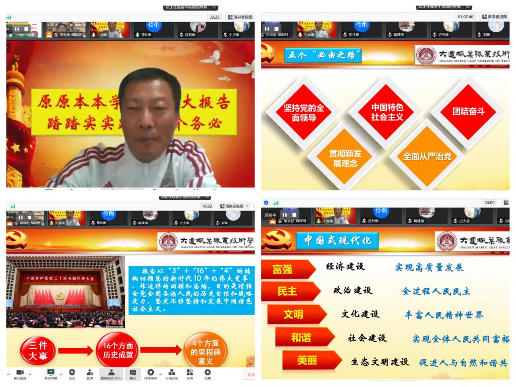 讲座围绕宣传贯彻党的二十大精神,以党的二十大报告精神为指引,踔厉奋发,笃行不怠,推动教育教学再上新台阶,全面提升学院双高建设水平。通过今天的学习,在今后的工作中,我们要把党的二十大精神融入思政课教学,不仅要率先学深悟透党的二十大报告精神,逐字逐句、原原本本研读党的二十大报告全文,也要创新教学方法,确保党的二十大精神进课程进课堂进头脑。