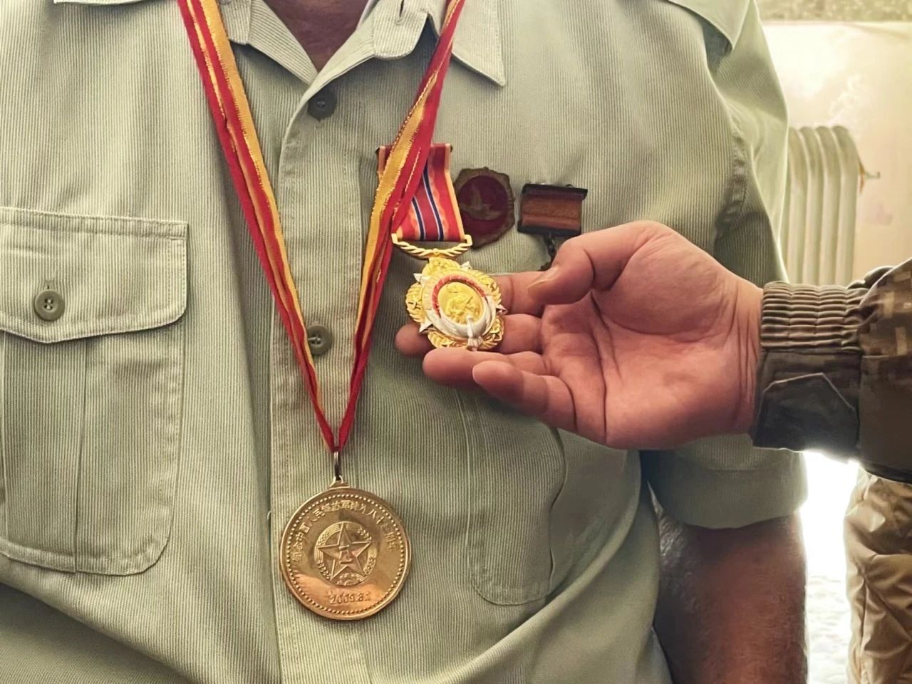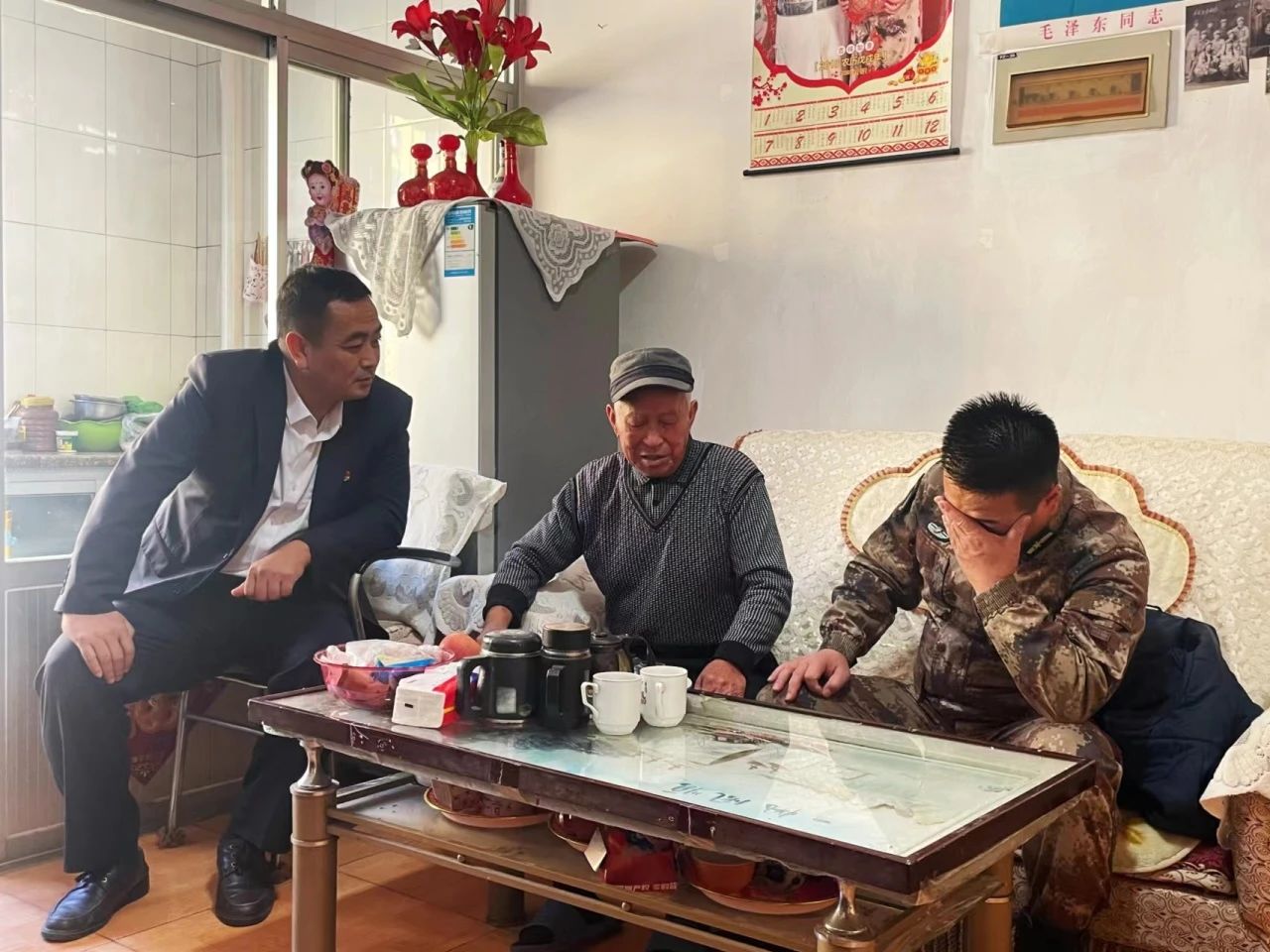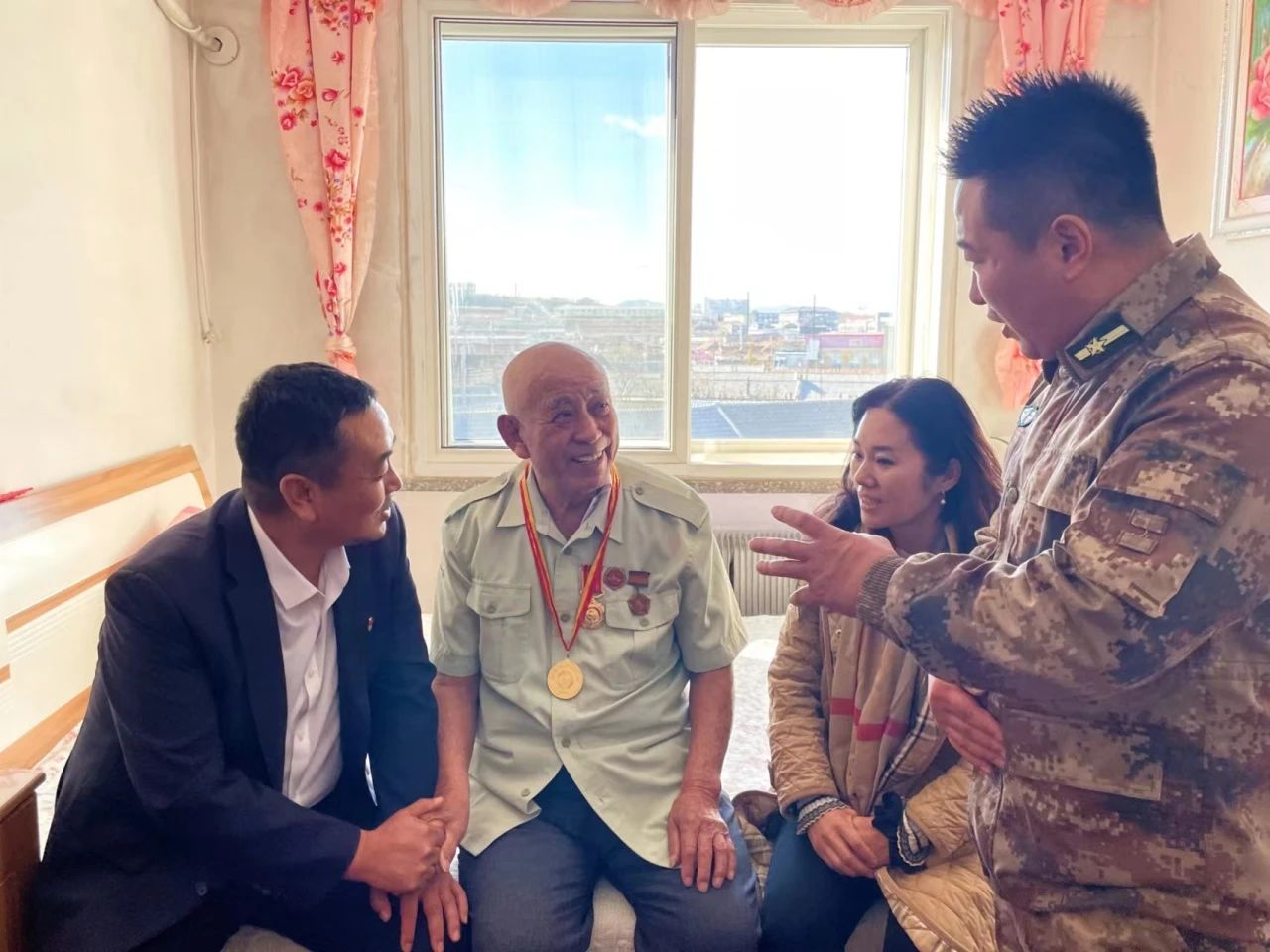 他是老兵王学忠,他热情地招待来慰问的同志们坐下。中职部党支部书记徐凤龙同志详细地询问了老人的身体健康状况和家庭生活情况,认真倾听老战士讲述自己在抗美援朝战争中的亲身经历,过程中,王学忠老人非常开心并热情地和徐凤龙同志握手,大家一起追忆峥嵘岁月,追忆那些为保家卫国舍生忘死的革命英雄事迹。