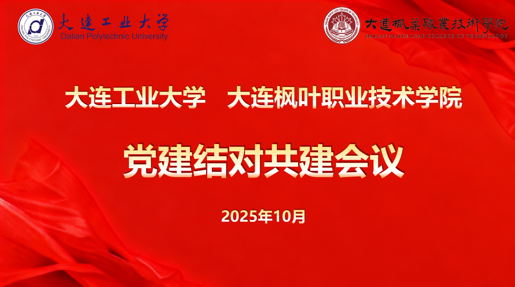 2025年10月14日,大连工业大学与大连枫叶职业技术学院党建结对共建会议在枫叶职院七顶山校区举行。大连工业大学党委书记苑晓杰、校长李长吾、党委副书记那广利,枫叶职院董事长杨萍、党委书记魏晓峰、党委副书记兼校长杨捷等领导及双方职能部门负责人参会。
