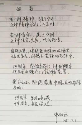 为庆祝中国共产党成立99周年,缅怀党的光辉历程,讴歌建党以来取得的伟大成就,激发党员爱党爱国爱校的热情,构建和谐、向上的文化氛围,学工党支部举办了“庆七一”线上书法展示活动。