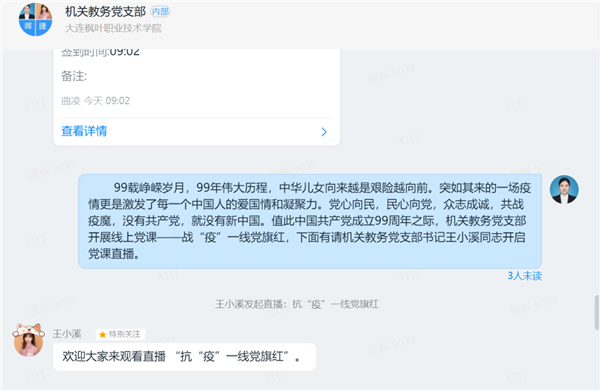 机关教务党支部,7月1日-7月7日,陆续开展线上学习《习近平新时代中国特色社会主义思想学习纲要》、线上观看党史题材影视片《建党伟业》、线上党课等活动,促使广大党员不断增强“四个意识”、坚定“四个自信”、做到“两个维护”,筑牢信仰之基、补足精神之钙、把稳思想之舵。