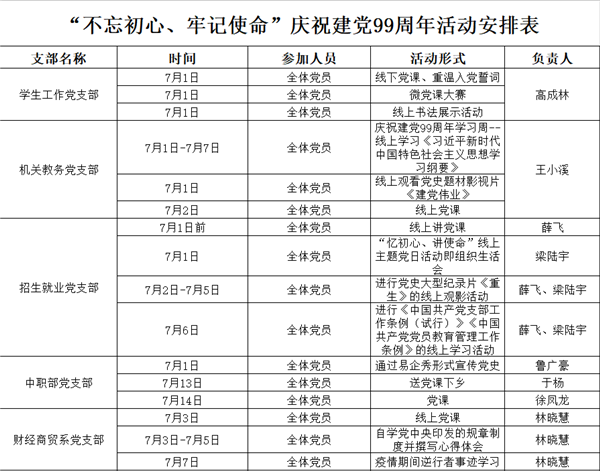 工程技术系党支部,计划7月6日-7月9日深入开展腾讯视频集体学习党史、《中国共产党支部工作条例(试行)》、《中国共产党党员教育管理工作条例》、“不忘初心 牢记使命”建党99周年献礼等活动,进一步坚定党员同志“感党恩、听党话、跟党走”的理想信念。