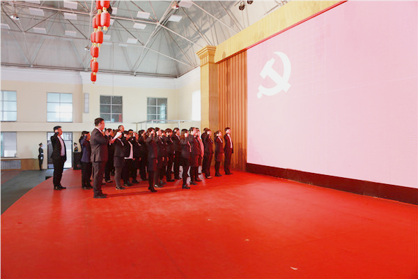 最后全体党员上台重温入党誓词,仪式在国际歌歌声中结束。