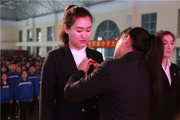仪式第一项由全体党员共唱国歌,随后党办主任聂俭丽宣读2016级442名入党积极分子名单及其培养人,并由培养人为入党积极分子佩戴胸牌,学校领导为拟发展对象佩戴胸牌。在仪式上,船舶珠宝系16级老年服务与管理班级朱晓桐同学带领全体入党积极分子,在鲜红的党旗下举起右手,庄严宣誓。“我是一名入党积极分子,我承诺:诚信做人,克己奉献,努力学习,服务社会,遵守纪律,率先垂范,心存感恩,报效祖国。用实际行动践行承诺,用信念履行责任。” 铮铮的誓言响彻在综合馆上空,也将永远铭记在每一名学生心中。通关系16会计班李溪同学代表入党积极分子发言时说到“路漫漫其修远兮,吾将上下而求索,在这样的道路上我们要通过重重考验,勇往直前”。通关系主任、党小组组长林晓慧同志代表入党积极分子培养人向仪式会上公开了六点承诺,并说到:“申请入党,就意味着你肩负使命;申请入党,就预示着你必须为完成使命而奋斗。年轻人应追求一种义不容辞的历史责任,追求一种鲁迅先生倡导的‘俯首甘为孺子牛’的精神,有了这种责任感和精神,便能甘当表率、众志成城、战不无胜!”