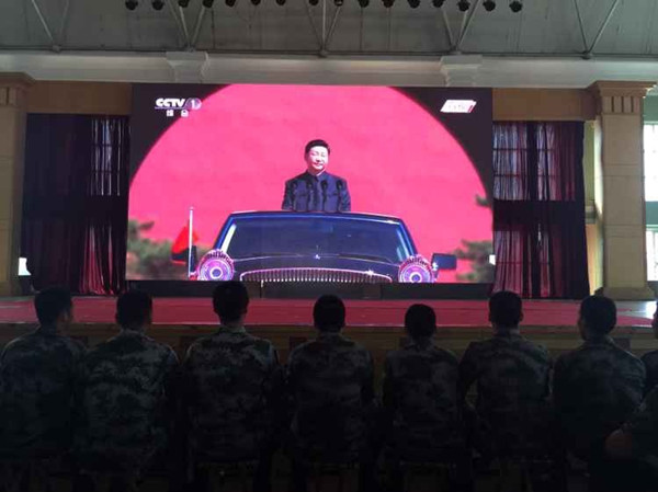 2015年9月3日,我国在北京天安门地区举行阅兵式,目的是为了铭记历史,缅怀先烈,珍爱和平,开创未来。这也是我国首次举行胜利日阅兵。为了让师生能够在第一时间看到阅兵式的直播,校党办宣传部、学生处、武装部、团委、网络中心、后勤集团等各部门联合协作,组织师生观看,安排放映点,调试网络,保障集体观看的顺利进行。