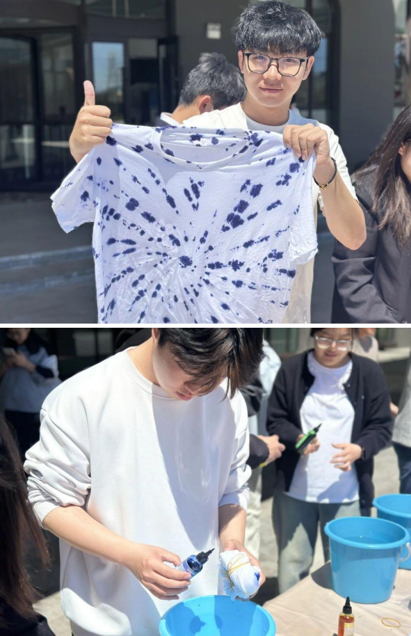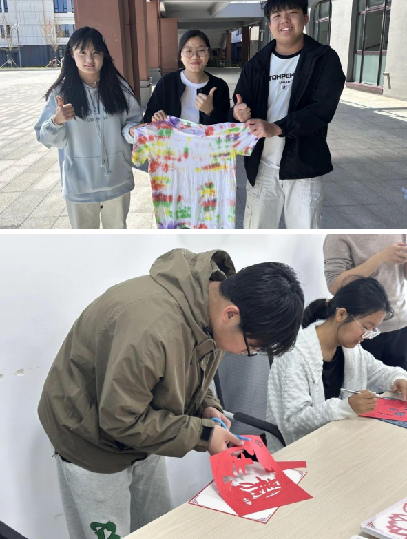 在本次活动中,同学们可以根据自己的兴趣,自由选择参与漆扇、扎染或剪纸的制作体验。在漆扇制作中,从选择喜欢的颜色,将彩漆点在水面,用搅拌棒巧妙搅拌形成独特纹路,再到将扇面垂直压入水中,让彩漆附着,最后通过晃动扇子,创造出独一无二的花纹;参与扎染时,可自由设计捆扎造型,调配染料进行浸染,见证布料在手中绽放出绚丽色彩;剪纸环节,同学们用剪刀剪出精美的图案,感受指尖上的艺术魅力。
