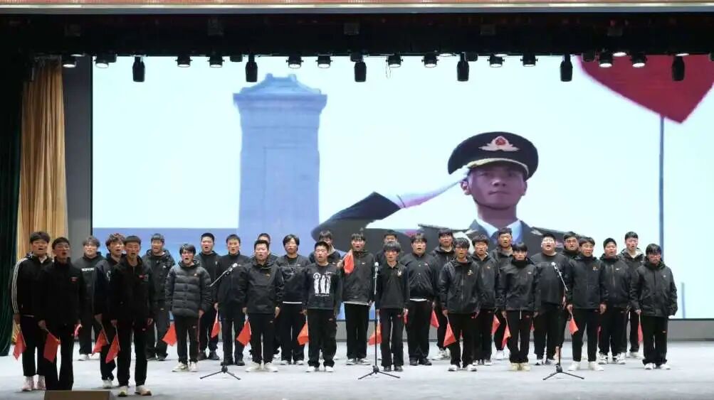 当智能制造未来学院的时代新声合唱团身着黑色衣服,迈着整齐的步伐踏上舞台,全场瞬间被点燃。他们的手势统一划向高空,像是擎起冲锋的旗帜;演唱间隙加入的踏步声,与旋律完美契合,仿佛能看到千军万马的壮阔图景。